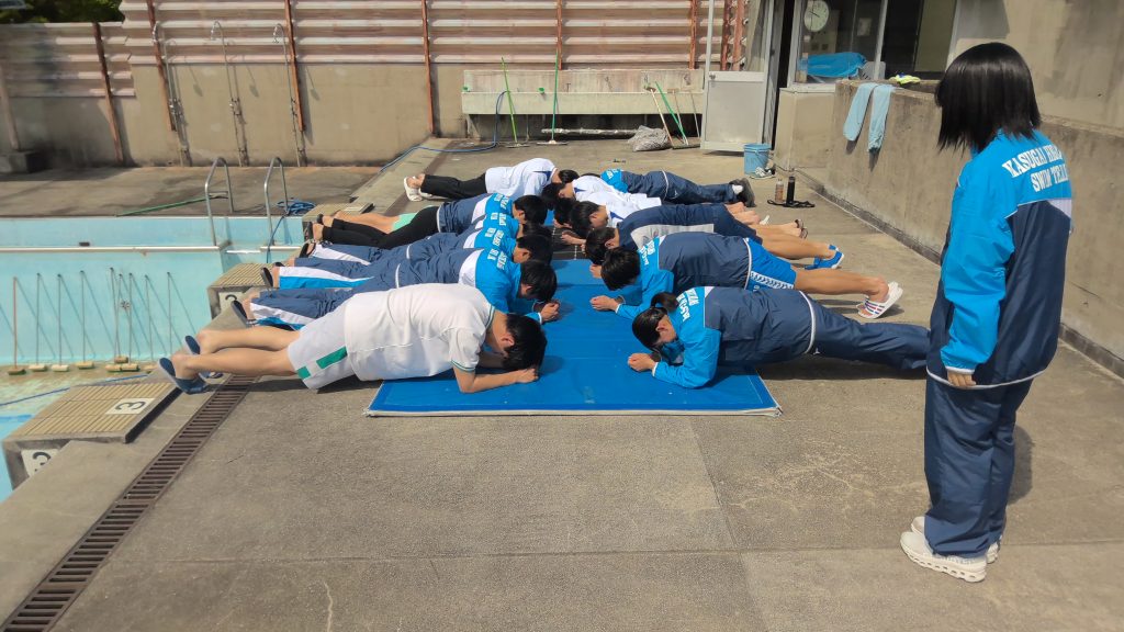 春日井東高校水泳部は「大会や記録会ごとに自己ベストを更新しよう」という目標のもとで練習を行っています。