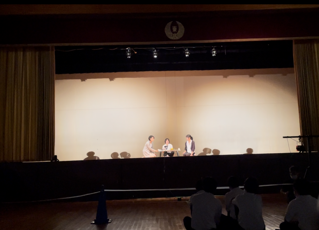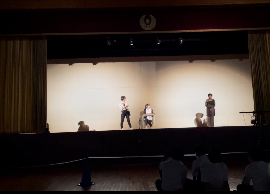 こんにちは、演劇部です。私たち演劇部は年2回の大会や自主公演に向けて毎日明るく楽しく活動をしています。演劇というと役者のイメージがあるかもしれませんが、役者だけでなく音響や照明、大道具、小道具、衣装などたくさんの役割があります。演劇をつくることで、言葉の知識やコミュニケーション能力がつくだけでなく、計画性や周りを見て行動する力などさまざまな力がつきます。部員募集中です!わたしたちと一緒に青春舞台をつくりあげましょう。